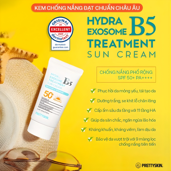 Kem Chống Nắng Pretty Skin Dưỡng Ẩm Và Phục Hồi – Hydra B5 Exosome Treatment Sun Cream là sản phẩm chăm sóc da cao cấp đến từ thương hiệu Pretty Skin của Hàn Quốc, với dung tích 50ml. Sản phẩm kết hợp công nghệ chống nắng tiên tiến và các thành phần dưỡng ẩm, phục hồi da, giúp bảo vệ làn da khỏi tác động của tia UV mà vẫn duy trì độ ẩm cần thiết. Được phát triển dành cho những ai mong muốn một lớp bảo vệ hàng ngày hiệu quả, kem không chỉ chống nắng mà còn hỗ trợ da phục hồi sau tiếp xúc với môi trường bên ngoài.