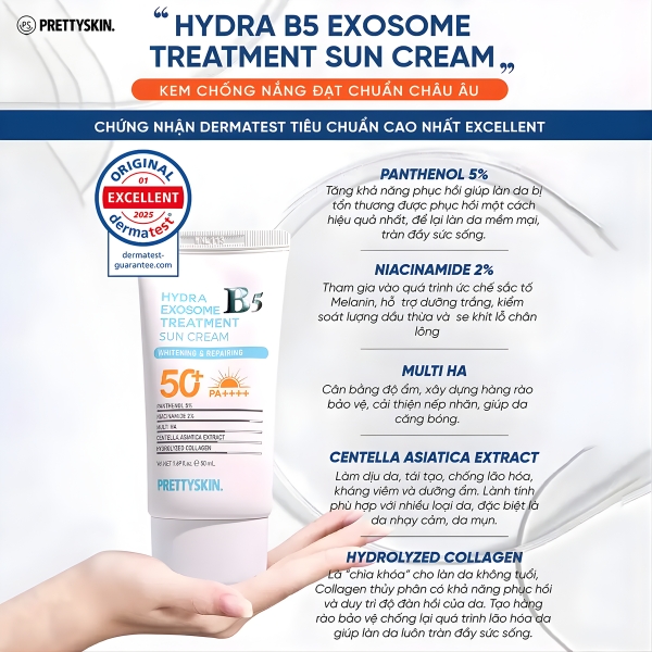 Kem Chống Nắng Pretty Skin Dưỡng Ẩm Và Phục Hồi – Hydra B5 Exosome Treatment Sun Cream sở hữu chỉ số chống nắng cao SPF50+ PA++++, bảo vệ phổ rộng khỏi tia UVA, UVB và ánh sáng xanh HEV nhờ 9 màng lọc chống nắng tiên tiến như Titanium Dioxide, Zinc Oxide và Tinosorb S. Thành phần chính bao gồm Panthenol B5 5% giúp dưỡng ẩm sâu, Niacinamide 2% hỗ trợ làm sáng da và se khít lỗ chân lông, cùng công nghệ Exosome thúc đẩy tái tạo tế bào. Ngoài ra, sản phẩm còn chứa 11 tầng Hyaluronic Acid (HA) cấp ẩm chuyên sâu, chiết xuất rau má làm dịu da và collagen thủy phân tăng cường độ đàn hồi. Kết cấu kem mỏng nhẹ, dạng gel không gây bết dính, phù hợp thoa hàng ngày.