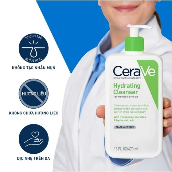 - Dưỡng ẩm sâu: Nhờ vào Hyaluronic Acid và Ceramides, Sữa Rửa Mặt CeraVe Dành Cho Da Khô – Hydrating Cleanser giúp da duy trì độ ẩm, giảm tình trạng khô ráp, bong tróc và mang lại cảm giác mềm mịn sau khi sử dụng.